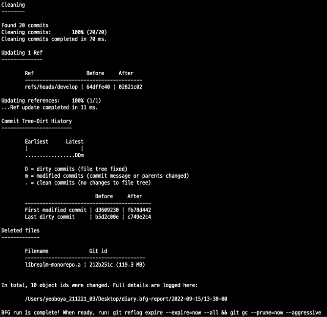 해당 명령어를 통해 원하는 repository 디렉토리를 설정해 100MB이상 파일 업로드 내역을 삭제한다.