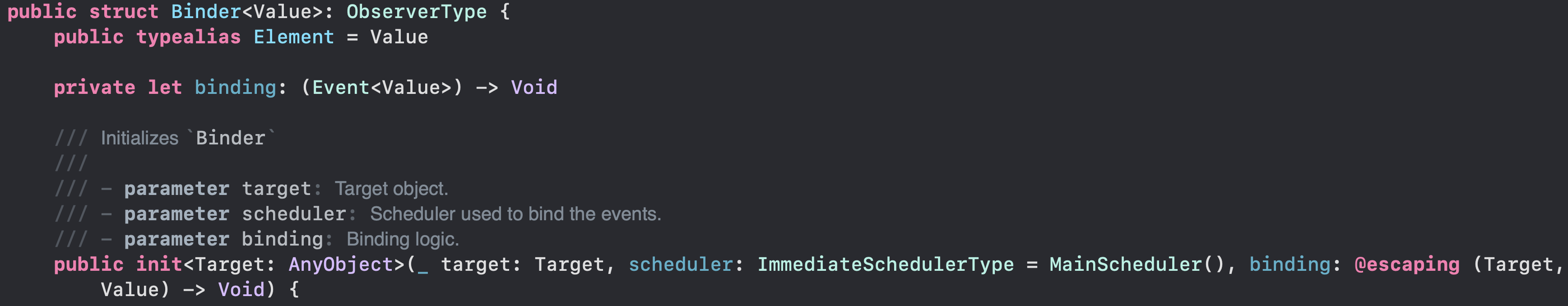 Binder를 정의합니다. 이때 변수명은 button.rx.~ 물결부분에 해당합니다. 타입은 Binder<바인딩 하고자하는 타입>으로 설정해줍니다.